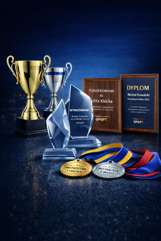 W GPGIFT pomagamy wyróżnić osiągnięcia i wyrazić wdzięczność w wyjątkowy sposób. Oferujemy eleganckie puchary, statuetki szklane i dyplomy drewniane, które podkreślają wartość każdej nagrody lub gestu uznania.